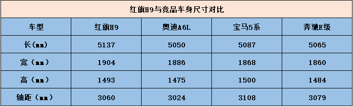 红旗H9在车身长度和宽度上占有一定优势,车身高度略低于宝马5系,轴距也略低于宝马5系和奔驰E级,但差距很小,基本可忽略不计。