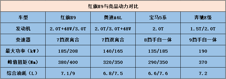 说完价格和尺寸上的区别,再来看看红旗H9较竞品车型在汽车核心动力和配置层面表现如何。