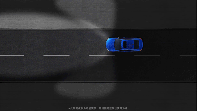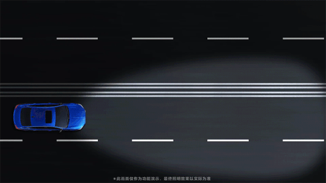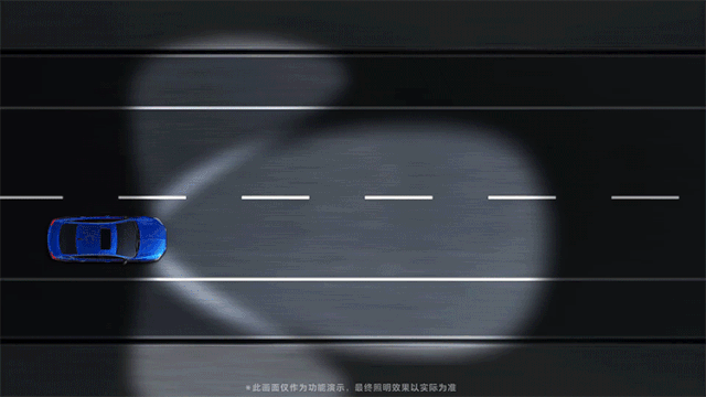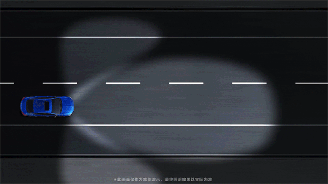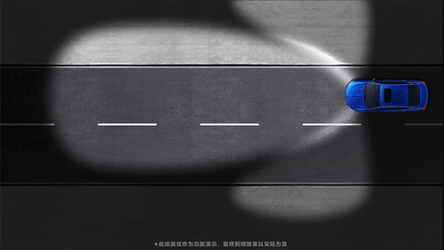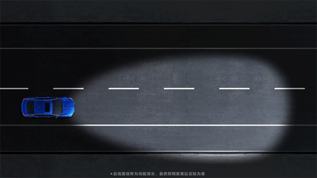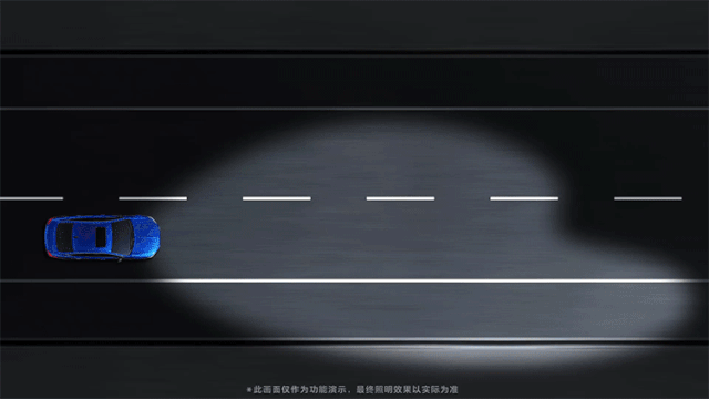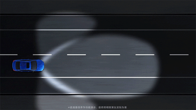 防眩目远光高速照明模式——当车速超过100km/h且经过一段时间后,将降低对向车辆区域的照明亮度,确保高速行车时,远光不会给对向车辆造成眩目。