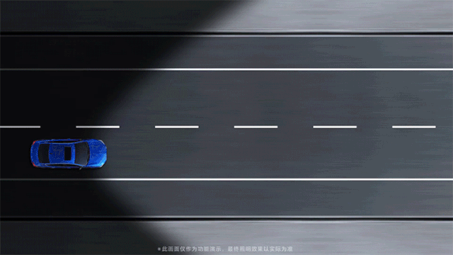 防眩目远光照明模式——当车速在50km/h以上之时,远光自动开启,并通过大灯分区控制,不会照亮同向及对向车辆所在区域且不断动态调整,从而确保不会对其它交通参与者造成眩目。