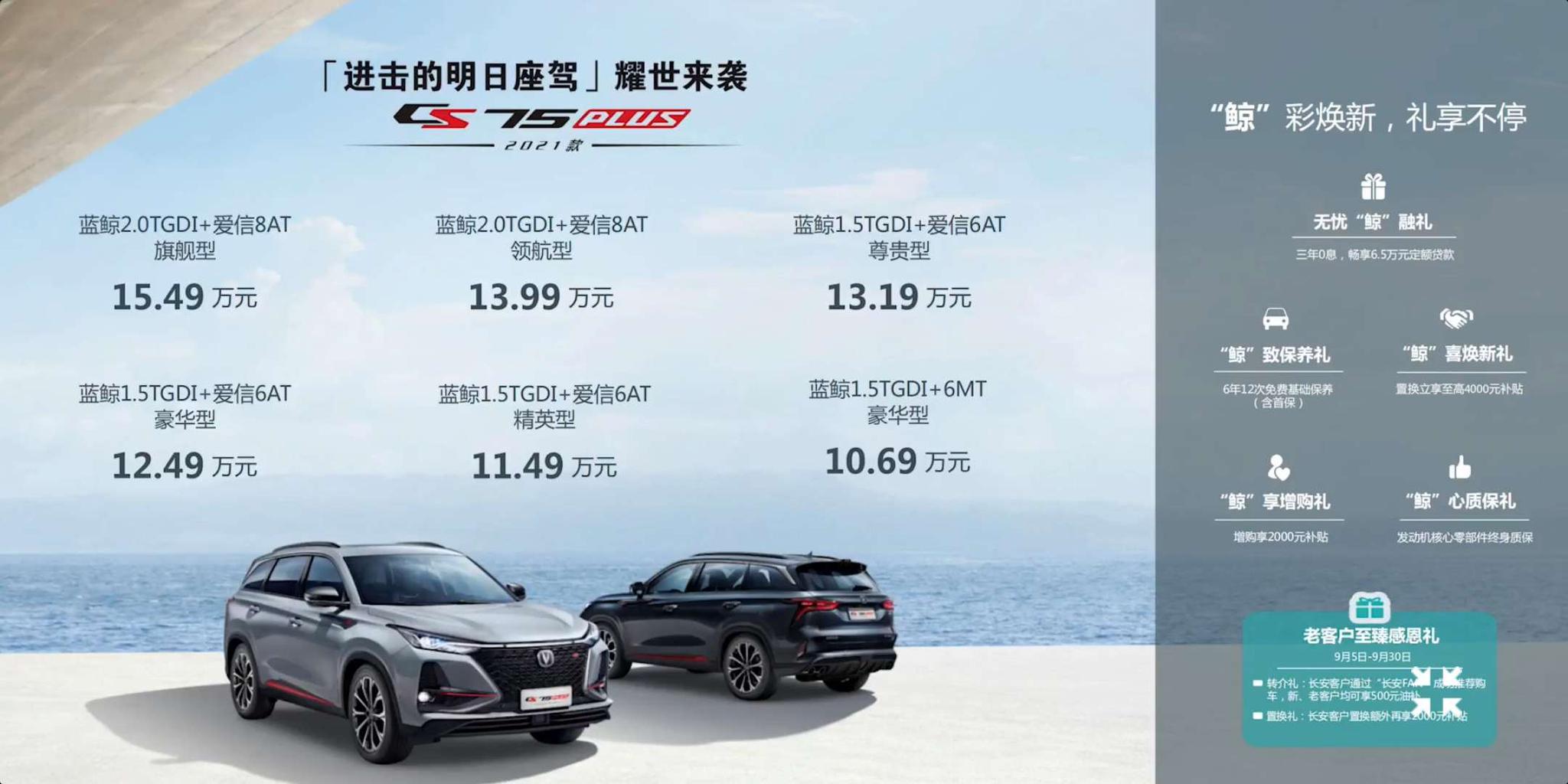 2020年9月5日晚间,2021款长安CS75 PLUS (配置|询价)正式上市,由于是年度小改款,新车最大的变化就是新增“原子灰”新配色,其他方面与在售车型差异不大。2021款CS75 PLUS依旧提供搭载1.5T(蓝鲸1.5TGDI)、2.0T(蓝鲸2.0TGDI)两种动力的6个车型款供选,整体指导价区间仍为10.69-15.49万元,没有发生变动。