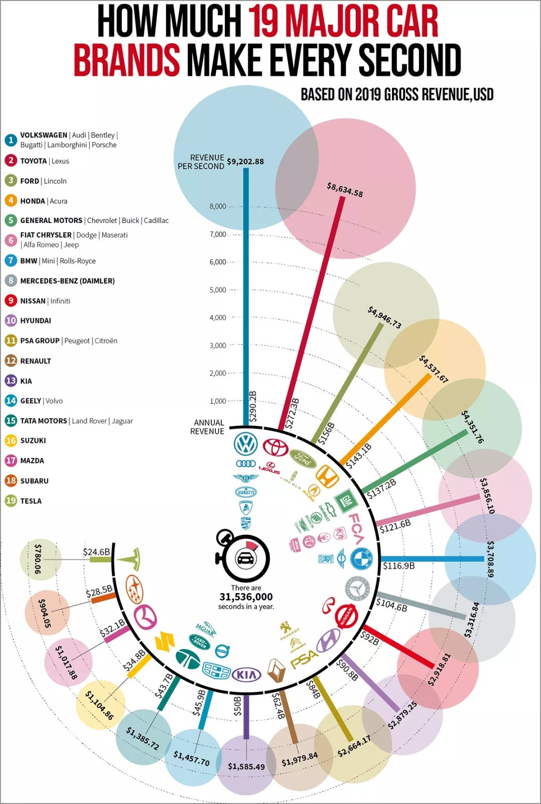 而作为车企中市值第一的特斯拉,则在2019年实现了每秒钟780.06美元的营收,约合人民币5338元,排在所有跨国车企中的第19名,也就是该榜单的最后一名。