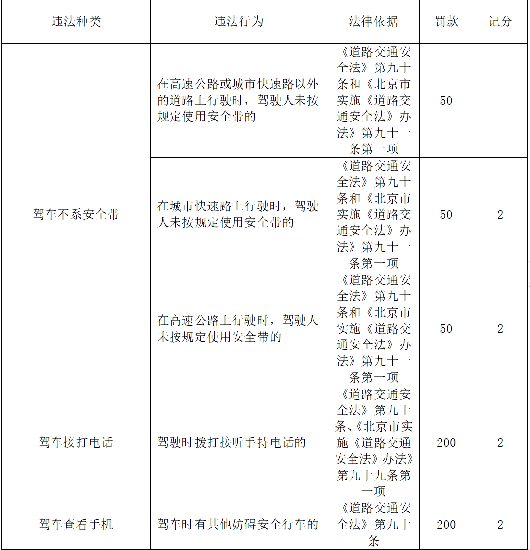 具体处罚依据和标准可以参考上表。其中,驾车时查看手机,最高可处200元罚款、记2分的处罚;而开车不系安全带则最高可处50元罚款、记2分的处罚。
