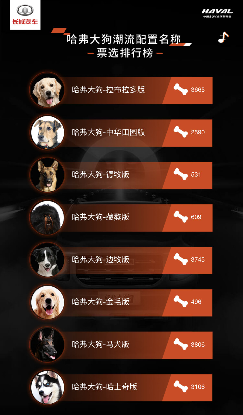 继当初车型名称投票之后,最近长城汽车又针对哈弗大狗的各款配置命名开启了全网投票活动。根据官方数据显示,在9月3日18:00活动结束后,最终马犬版以3806票获得了第1名,紧跟其后的则是3745票的边牧版。第3名是3665票的拉布拉多版,第4名则是3106票的哈士奇版。