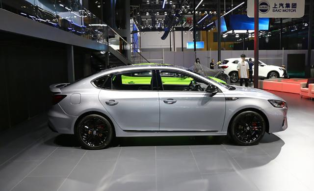 车身侧面,新款名爵6 PHEV采用了分段式腰线设计,结合车顶溜背式造型,看上去非常帅气。同时,新车A,B,C柱使用了黑色饰板营造出了悬浮式车顶效果,搭配黑化后的多辐式轮圈,并在内部配有红色刹车卡钳,进一步提升了运动气息。
