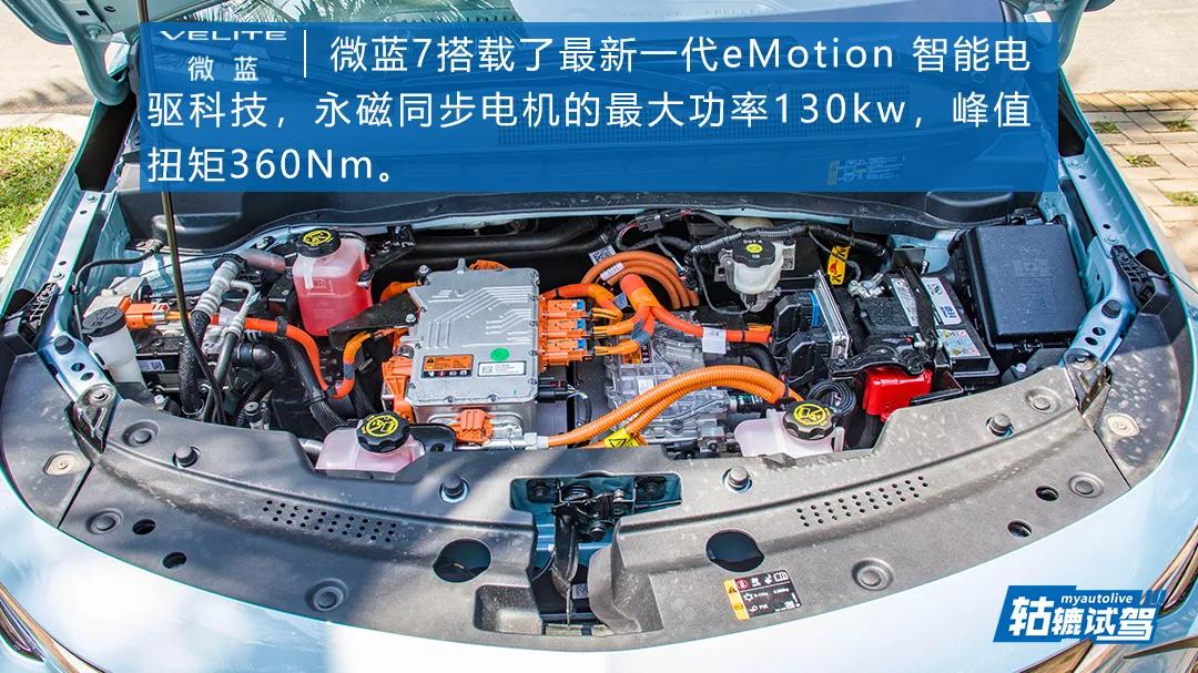 而微蓝7的加速感受不同,即便电门踩到底,它的电力依然是线性且平顺地输出,这虽然牺牲了一定的加速感,但有效保证了行驶舒适性。需要一说的是,即便微蓝7的加速感不如其它纯电动车强,但是远比燃油车轻快,这不仅是因为电机的优势,还有其强劲的电力性能,这款车的永磁同步电机的最大功率是130kw,峰值扭矩为360N·m,在标准下就能感受到该电机充足的电力储备。