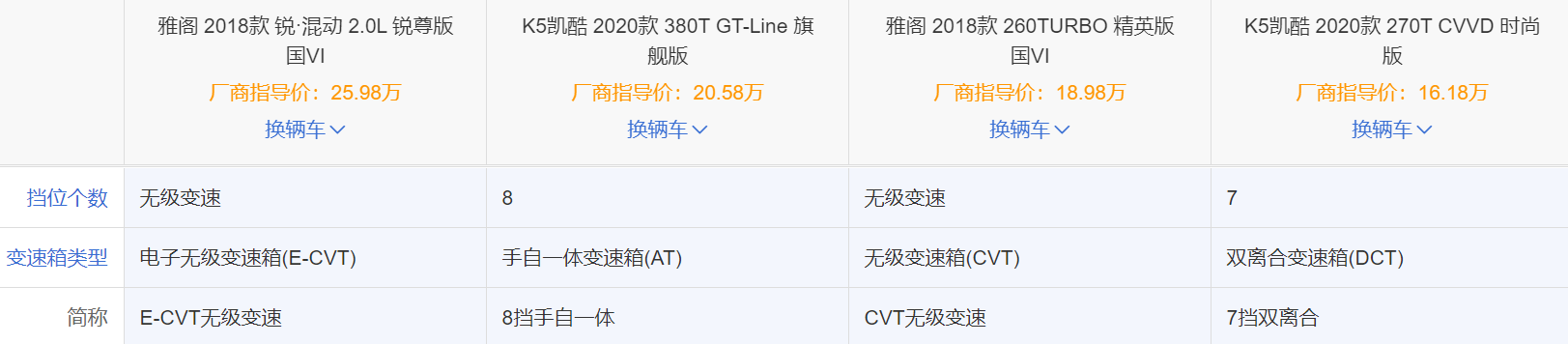 在变速箱方面,雅阁当然很平顺,但加速体验很一般。而K5则配备了8AT和7速DCT变速箱。