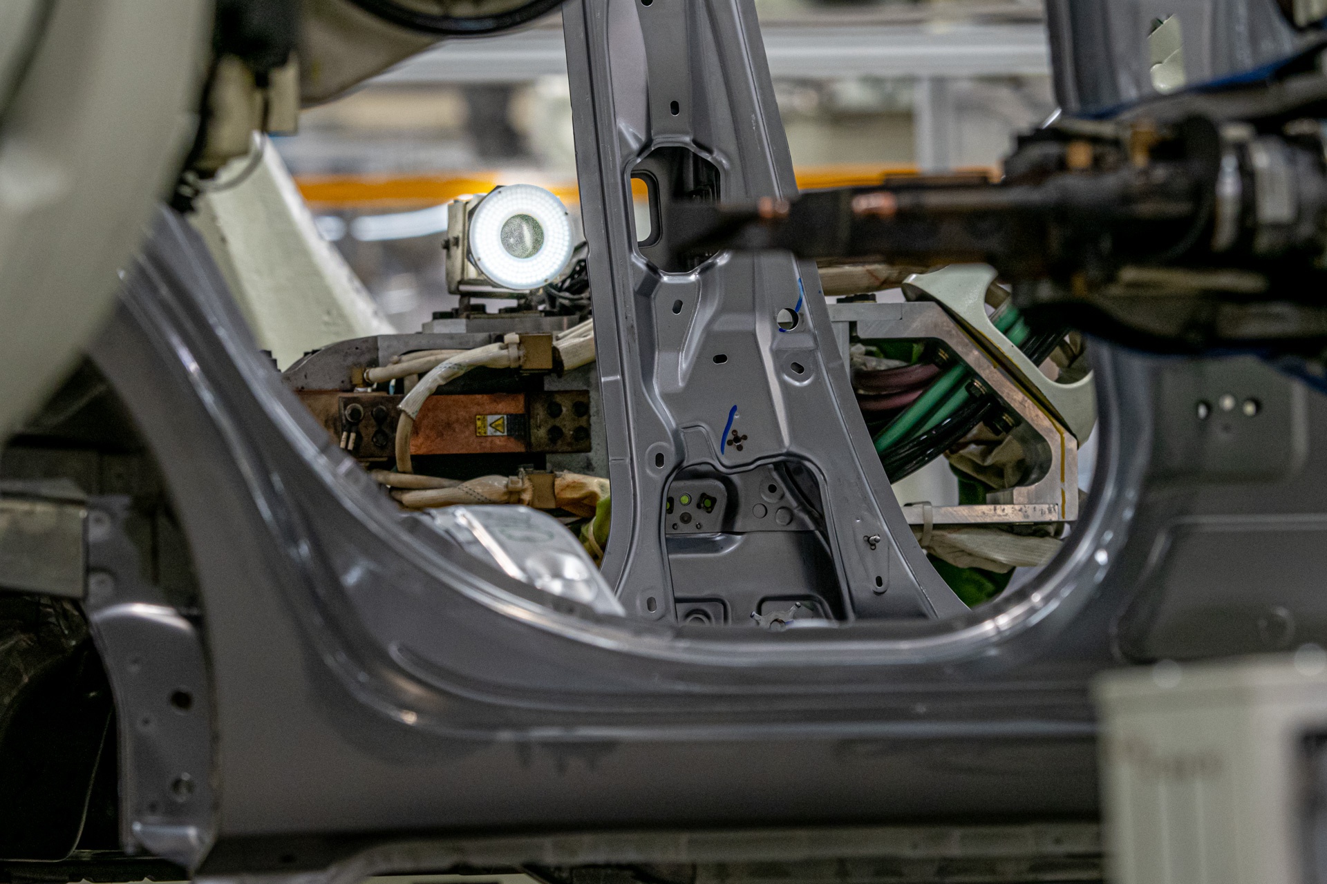 在生产线中,激光会随时对车辆前部、侧边、尾部进行精度测量,并为焊点拍照,如精度超过了±1.5mm,机器就会进行自动报警。