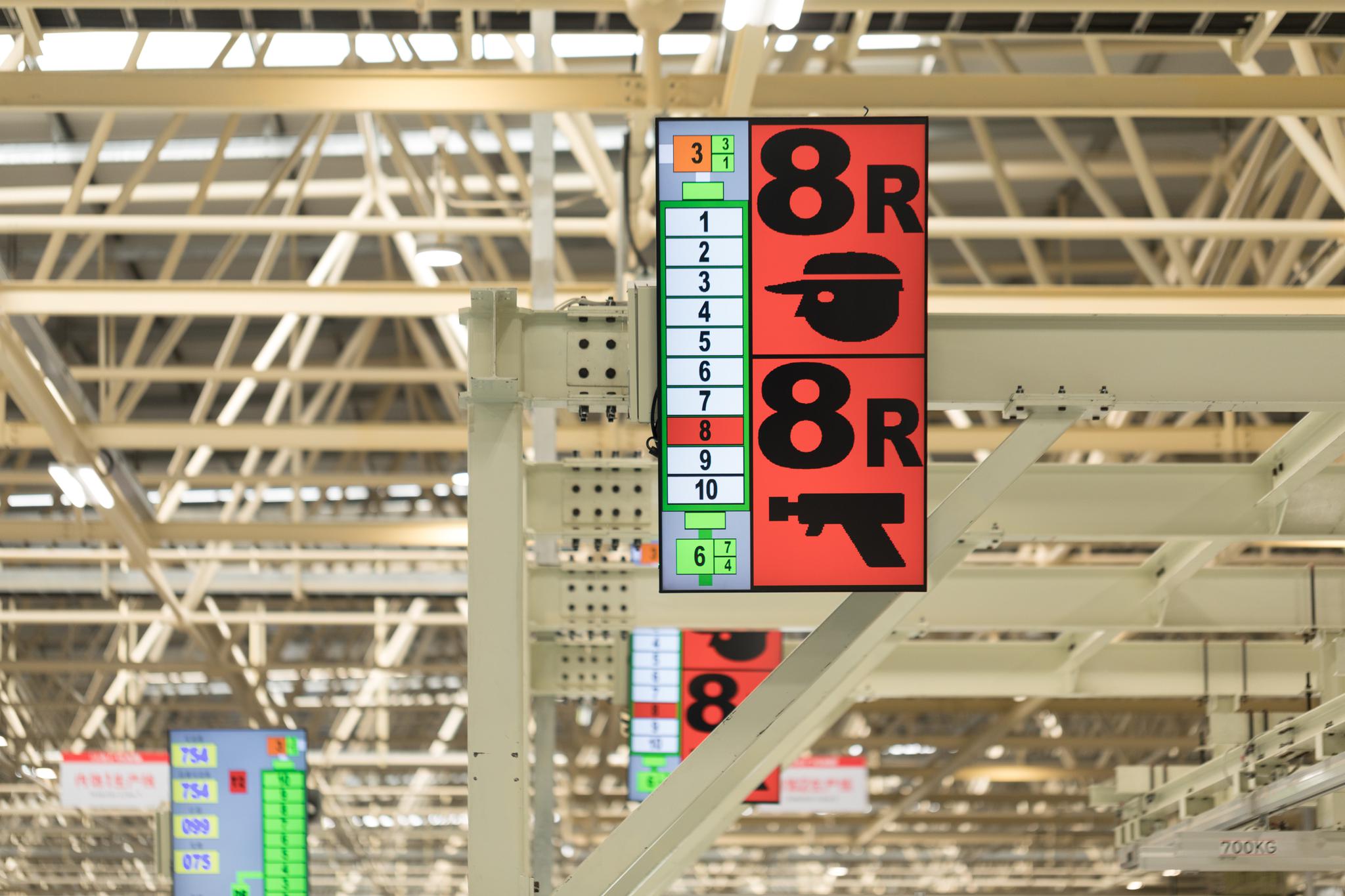 为了保证产品的高品质,丰田的生产线中还有独特的安东系统防止不良品的流出;如通过刀具检测装置,加工刀具在破损时设备会自动停止,就会在安东系统上显示异常,此时,作业者会立刻确认异常内容并处置,调查原因。