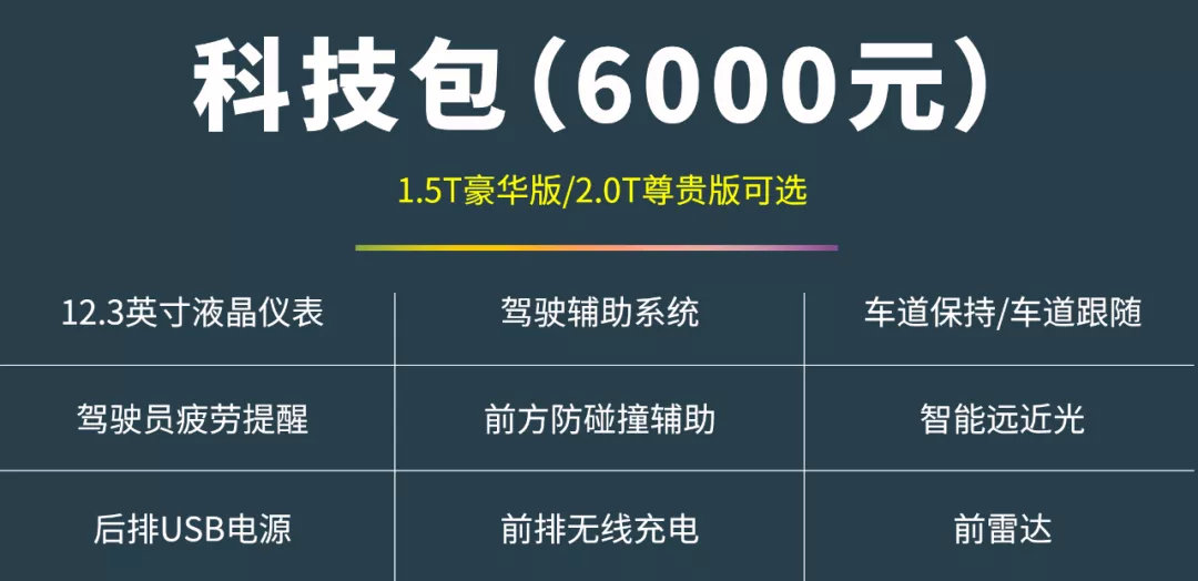 科技包同样价值6000元,供给1.5T豪华版和2.0T尊贵版选择,包括12.3英寸液晶仪表、防碰撞驾驶辅助系统、前排手机无线充电等配置。