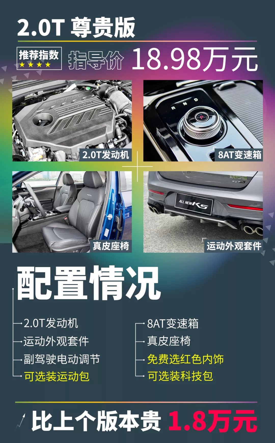 其实按照官方的说法,顶配车型相当于出厂标配了价值6000元的科技包以及价值3000元的智行包。并且获得了独享的奢享包选装权利。如果预算十分充足,且对于配置要求较高的话,可以直接选择顶配,并且选装运动包(3000元)和奢享包(3000元),这样一来,车辆的实际价格应该是21.18万元。就能够获得了一辆“顶中顶”配置的2.0T K5了。