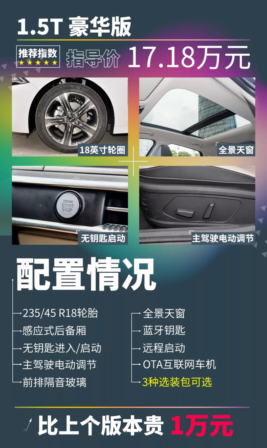 加1万升级到1.5T豪华版,将获得18英寸轮圈、全景天窗、无钥匙进入/启动、主驾驶电动调节、前排隔音玻璃、OTA车机等功能。更重要的是,1.5T豪华版提供了3种选装包(舒适包、科技包、智行包)可供选择,这1万块不仅获得了配置上的提升,更是极大程度提升了购车时配置的自由度。因此,1.5T豪华版获得了我们的5星推荐。