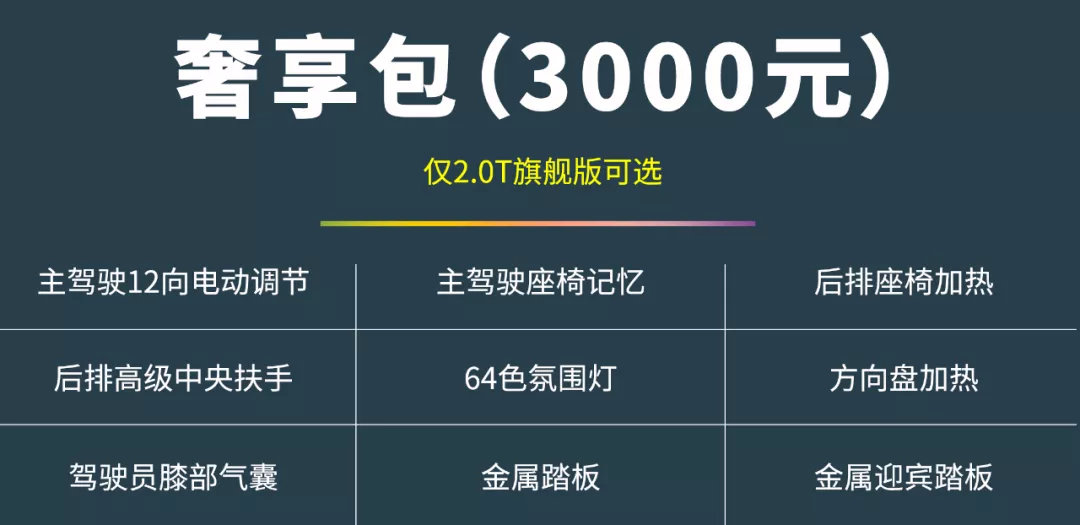 如果购买2.0T尊贵版的话,强烈建议加3000元选装运动包,获得19英寸轮圈以及前排座椅加热通风,配置就已经相当齐全了。因此,2.0T尊贵版也是比较值得推荐的配置,4星评价。
