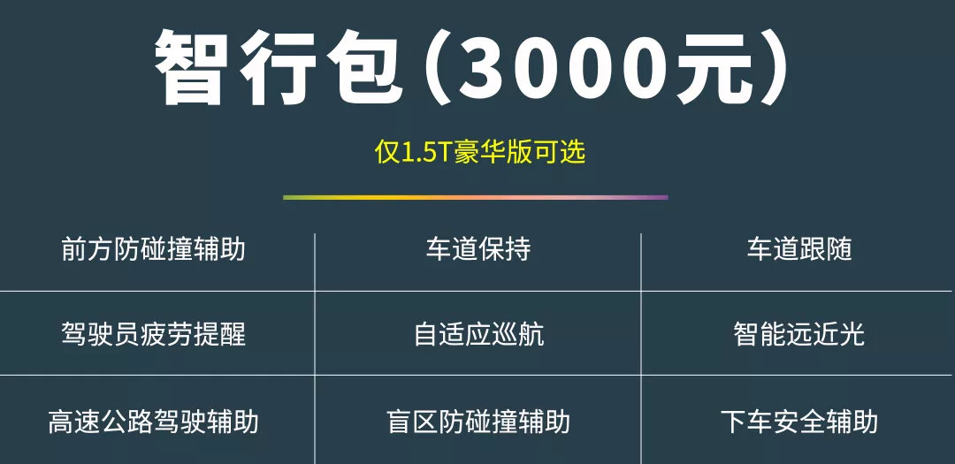 通过名字也不难判断,价值3000元的智行包主打驾驶辅助系统,包含车道保持辅助、自适应巡航、防碰撞预警以及高速驾驶辅助系统。这个选装包,也只有1.5T豪华版可选。