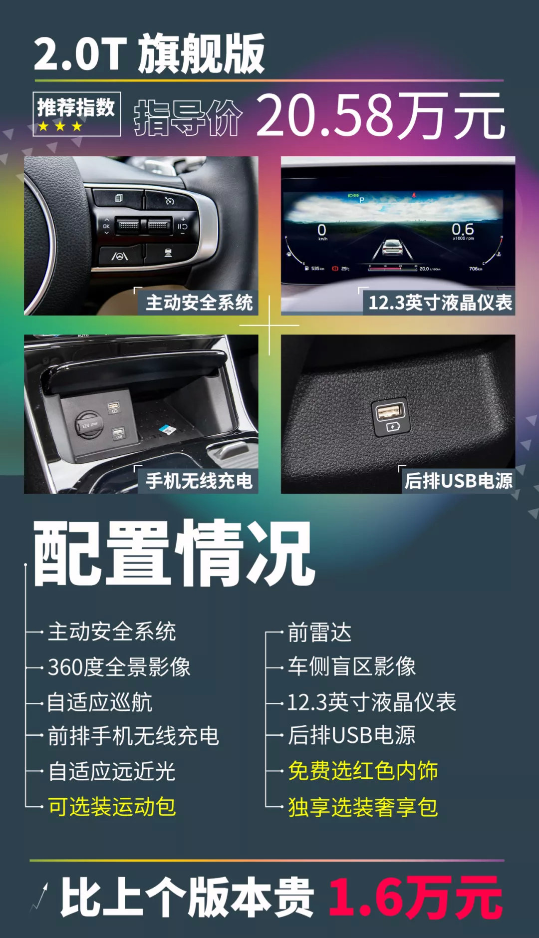最后就是全系最顶配的2.0T旗舰版了,售价20.58万,相比尊贵版贵了1.6万元。在配置方面增加了主动安全系统、全景影像、ACC自适应巡航、前排手机无线充电等配置。