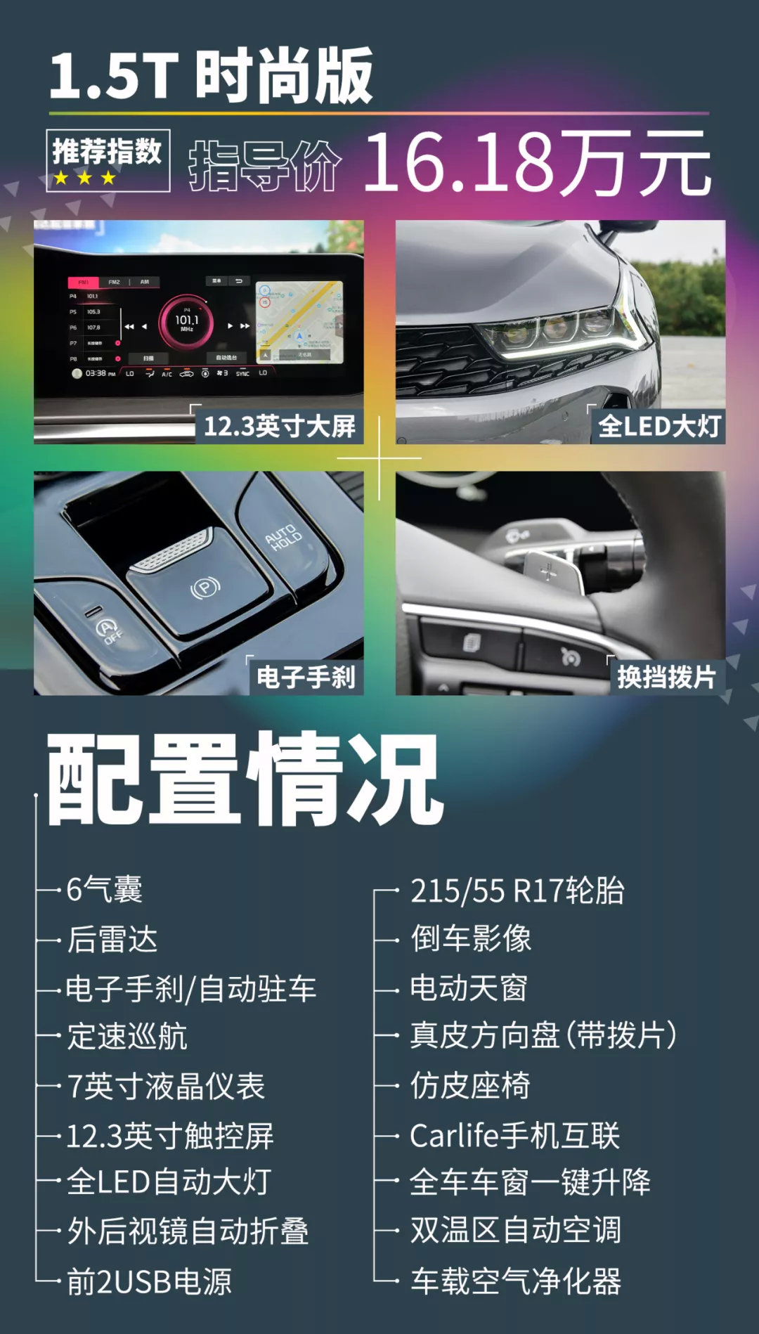 首先是全系最低配,售价16.18万的1.5T时尚型。在配置方面,标配17英寸轮圈、6气囊、电子手刹、电动天窗、7英寸液晶仪表、12.3英寸中控大屏、LED大灯等配置,满足日常使用没什么问题。不过,作为最低配车型,它没有无钥匙进入/启动,没有电动座椅。