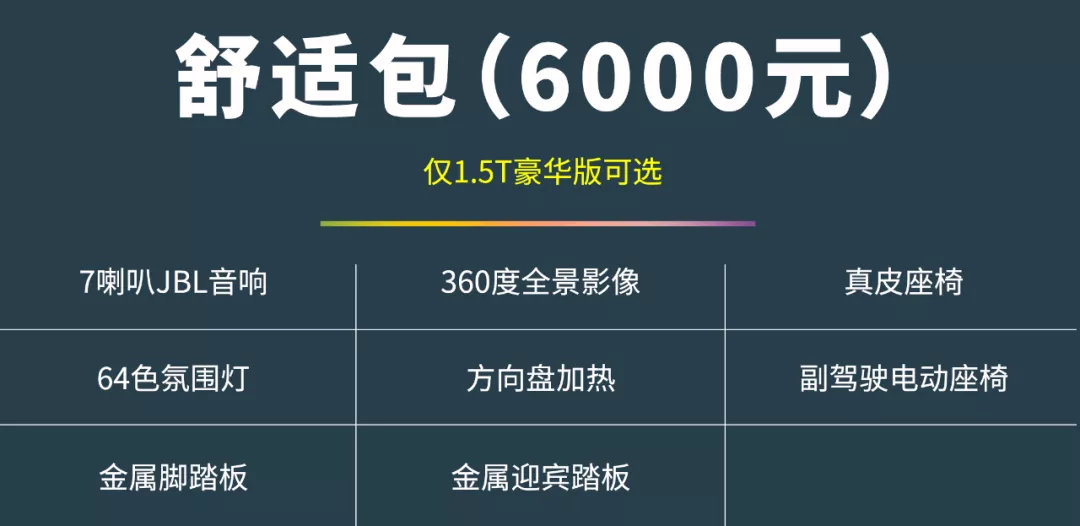 首先我们先来看看此次起亚重点推广的选装包政策。目前官方推出了共5种选装包,不同配置的车型,可以选择的选装包也不一样。舒适包价值6000元,提供了JBL音响、真皮座椅、全景影像等配置。这里要特别提一嘴,6000元的舒适包只有1.5T豪华版可以选装,而2.0T的尊贵版不提供舒适包的选项,顶配的2.0T旗舰版则出厂标配了舒适包中的配置。