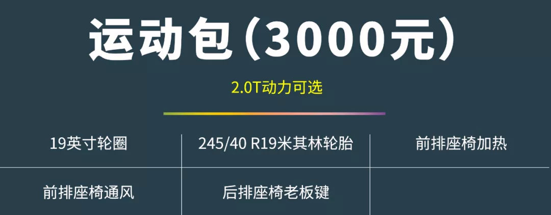 价值3000元的运动包提供给2.0T的两款车型选择,包括19英寸轮圈、245/40 R19规格的米其林轮胎、前排座椅加热通风以及后排老板键。从性价比的角度来说,3000元的运动包也是非常划算的,尤其是前排座椅加热通风,能极大提升车辆的使用感受。
