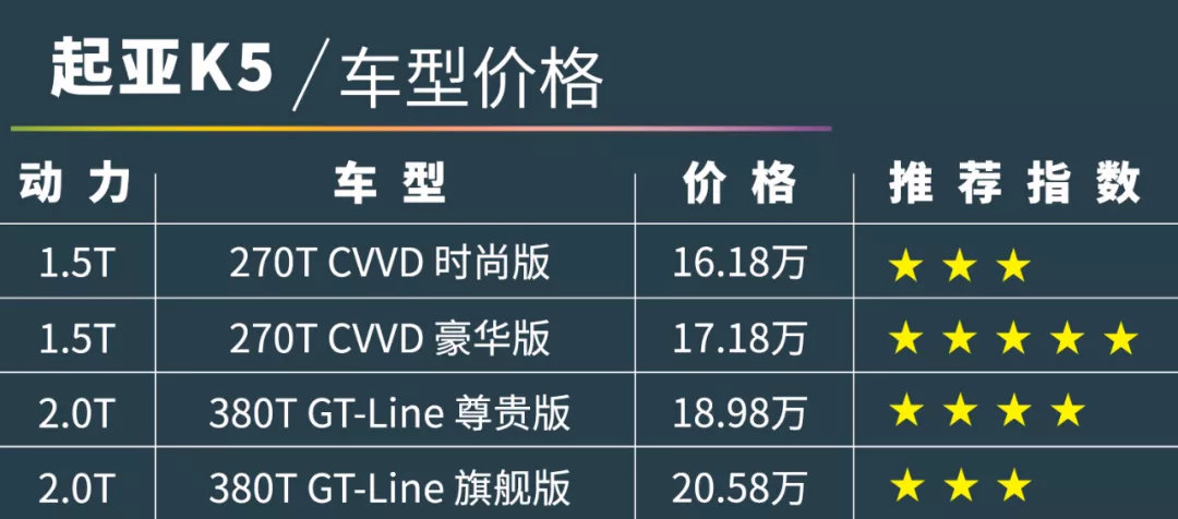 简单回顾完全新K5的参数信息后,接下来我们逐一分析下各款配置的性价比。