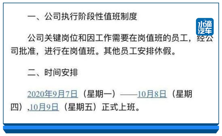 9月8日,一篇汉腾汽车通知员工继续休假的通知在网络疯转。通知的主要内容为:除了关键岗位和在岗值班员工,其他员工安排休假。休假时间为2020年9月7日-10月8日,10月9日正式上班。在此之前,汉腾汽车员工刚刚结束8月份开始的“高温假”。