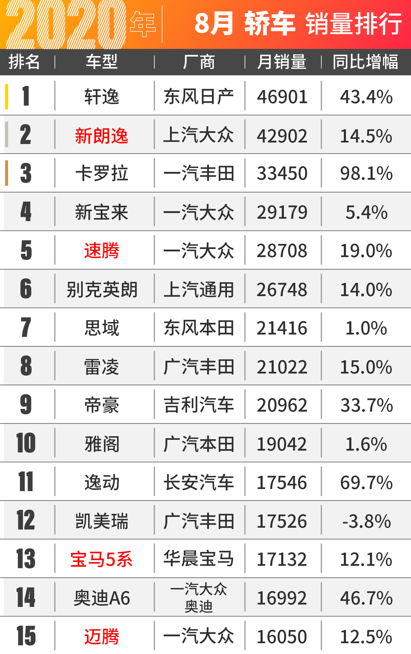 随着疫情慢慢被人淡忘,8月份的车市应该是今年以来最正常的一次了!不仅各个车型的销量相比起上个月有了不同程度的上涨,而且还有5家厂商的月零售销量突破了10万台大关。更令人意想不到的是,消失了8个月之久的大众迈腾 (配置|询价)竟然又杀回来了!