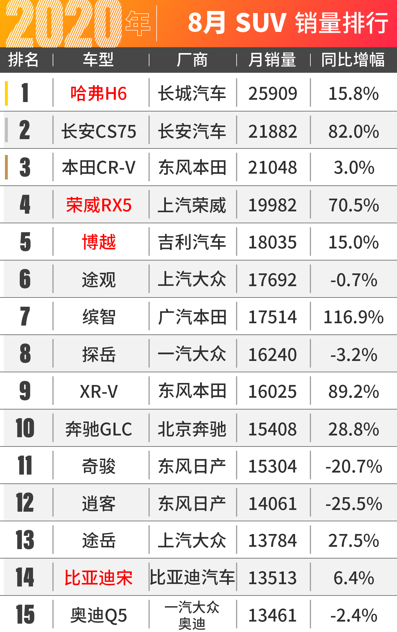 除了荣威以外,另一个国产品牌--吉利也终于在8月份开始发力。旗下旗舰SUV博越在经历了将近一年左右的低迷期后,终于又一次卷土重来,拿到了榜单第五名的好成绩。其实想想就能明白,如此出色的产品力配上最低配自动挡11万元的落地价,又有多少人可以经得住诱惑呢?
