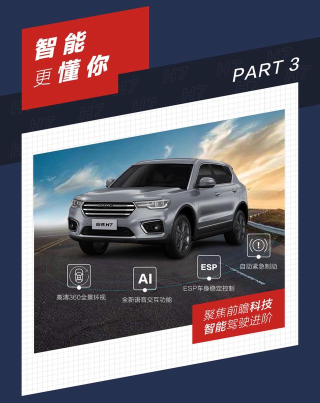 至于车辆安全性,哈弗H7新车采用了高刚性安全结构车身与双防撞梁设计,大量运用高强度钢及热成型钢,于被动安全上表现优秀;而且搭载了诸多主动安全系统,如车道偏离预警、前车碰撞预警、超速预警、巡航辅助、自动紧急制动、车道保持等配置。