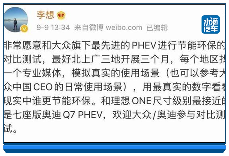 而被称为“网络毒舌级网络评论员”的李想自然对这样的言论不会置之不理,在冯思翰发表这样的言论后第二天,理想汽车创始人、CEO李想在其个人微博便向大众发出了一个极具“火药味”的微博“战书”,“非常愿意和大众旗下最先进的PHEV进行节能环保的对比测试,最好北上广三地开展三个月,每个地区找一个专业媒体,模拟真实的使用场景(也可以参考大众中国CEO的日常使用场景),用最真实的数字看看现实中谁更节能环保。和理想ONE尺寸级别最接近的是七座版奥迪Q7 (配置|询价) PHEV,欢迎大众/奥迪参与对比测试。”