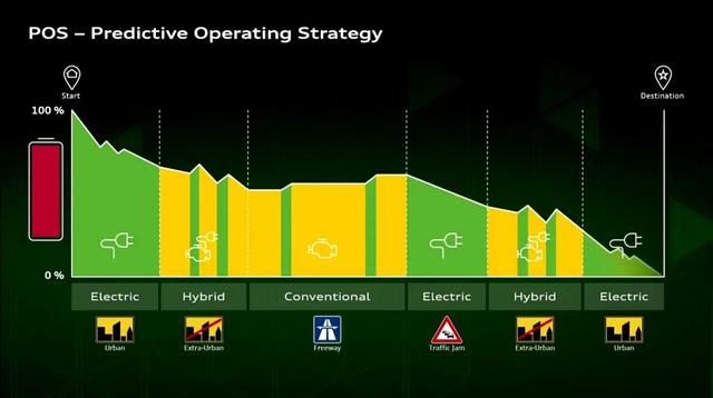 奥迪预测式高效驾驶辅助(Predictive Efficiency Assistant, PEA)和预判式操作策略(Predictive Operating Strategy, POS)是PHEV车型的技术核心。通过预测性推进及能量回收管理,这两个系统都可最高效地利用储在锂离子电池中的电能,亦可将大量动能转为电能给电池充电。