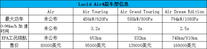 Air Touring版本最大功率620马力,0-96km/h加速时间为3.2秒,EPA工况续航653km,售价为95000美元;Air Grand Touring版本最大功率为800马力,0-96km/h加速时间为3秒,EPA工况续航832km,售价为139000美元;Air Dream Edition版本最大功率可达1080马力,0-96km/h加速时间为2.5秒,EPA工况续航748km/810km,售价为169000美元,其中前者将在2021年第四季度交付,后两者将在2021年第二季度交付。