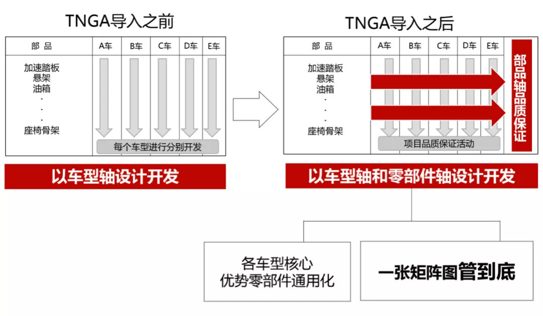 此前,丰田车型在新车研发阶段都是单车单独进行的(上图左侧)。而在TNGA导入后,便升级为了双线开发,在之前的单车路径之上,又叠加了一条通用零部件路径(上图右侧)。