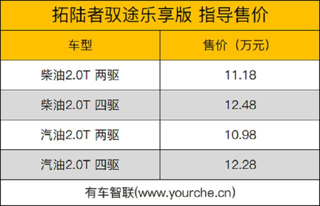 日前,我们从相关渠道了解到,拓陆者驭途乐享版正式上市。新车推出柴油版两驱/四驱,汽油版两驱/四驱等车型,售价区间为10.98万-12.48万元。