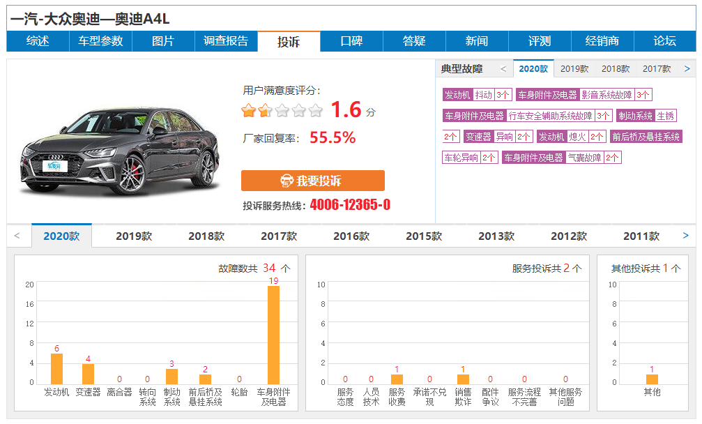 口碑层面:数据依然来自【车质网】,2020款一汽大众奥迪A4L投诉量和投诉率都是三位选手里最低的,而且令人欣慰的是在动力总成的投诉量上也是较少的。而A4L的投诉问题集中出现在车身附件和电器层面,占比超过了50%,希望能够引起主机厂的重视。