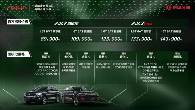 近日,东风风神AX7 (配置|询价) PRO正式上市,按照款型配置分1.6T 6AT智能版、1.6T 6AT智驾版、1.6T 6AT荣耀版三款,售价分别为12.39万元、13.39万元、14.39万元。此外,AX7 2021款也更新上市,1.5T 6MT质享版8.99万元、1.6T 6AT质越版10.99万元。