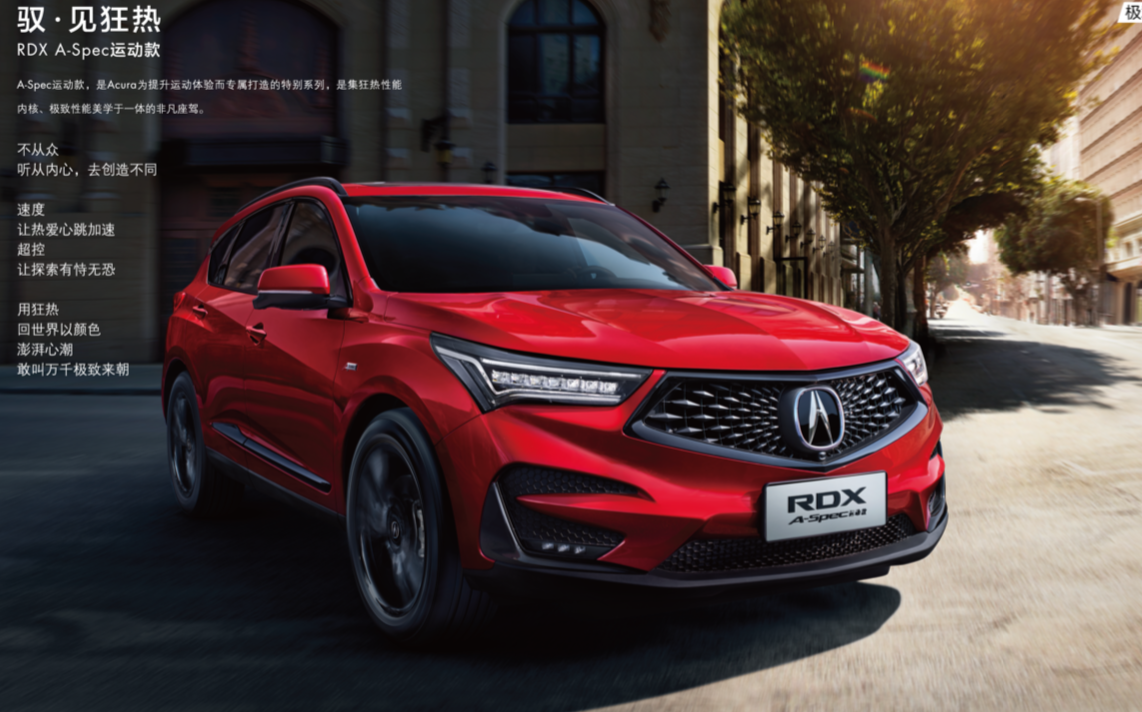 RDX A-Spec运动款是基于RDX打造而来,设计基本上保持一致,但是新增了很多运动化套件,更强调运动感,同时在前翼子板上有“A-Spec”专属标识以突出其不同身份。另外,其运动化气息还延续到内饰上,例如采用红黑撞色设计等。
