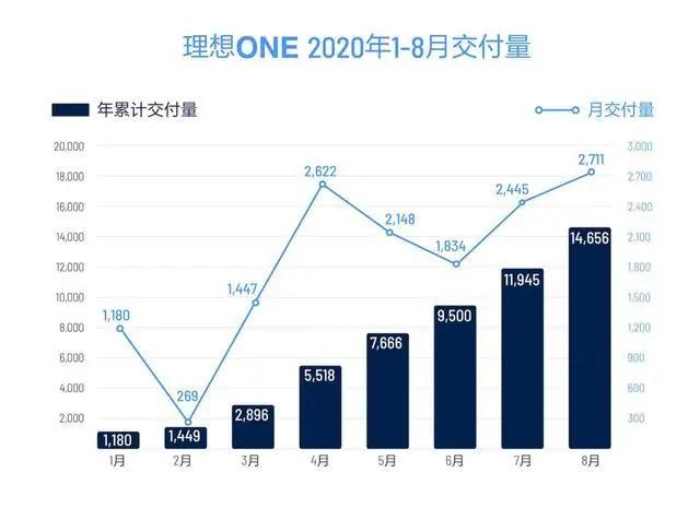 今年1-8月,理想汽车总计交付14656辆,在中汽协公布的2020半年8月份插电混动车型上险数以及1-8月份新能源大中型SUV累计上保险数量排行榜,榜单显示理想ONE均拿下了第一名。其中理想ONE的累计销量已经超过同级竞争对手蔚来ES8 (配置|询价)、特斯拉Model X (配置|询价)、等新能源中大型SUV。