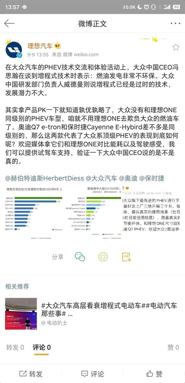 针对冯思翰的言论,9月9日理想汽车创始人李想对外表示回应称,非常愿意和大众旗下最先进的PHEV进行节能环保的对比测试,最好北上广三地开展三个月,每个地区找一个专业媒体,模拟真实的使用场景,用最真实的数字看看现实中谁更节能环保。和理想ONE尺寸级别最接近的是七座版奥迪Q7 PHEV,欢迎大众、奥迪参与对比测试。