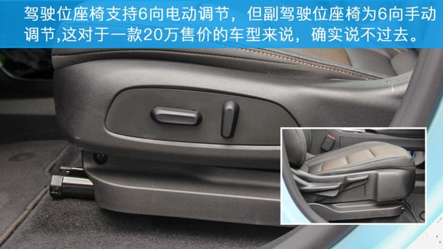 微蓝7的座椅整体比较偏硬,但是对身体有着不错的承托。主驾驶为6项电动调节,但副驾驶依然为手动调节,这对于一个20万左右的车来说确实有一些说不过去,还需要在日后的改款中进行升级。