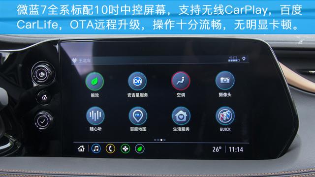 内饰部分,别克微蓝7采用了环抱式的座舱设计,中控屏幕以及空调面板很明显的向驾驶员一侧倾斜,营造出了不错的座舱氛围。全系车型标配8吋全液晶仪表以及10吋中控屏幕,虽然在尺寸上可能并不是非常大,但是无论是在显示功能还是在显示效果以及操作的流畅度上都有着很高的水准。尤其是中控大屏,在界面切换以及打开、关闭app时没有明显的卡顿。车机内部整合了百度导航、百度语音助手、百度随身听、360°全景摄影等功能,并且支持OTA远程升级以及无线Carplay。虽然在中控的软件部分并没有像许多国产车一样那么丰富,但是它所搭载的功能都会在日常中被高频率使用。