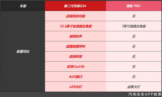 不过,第二代传祺GS4比博越PRO多出的配置也不少,比如:远程启动功能、12.3英寸全液晶仪表盘、后排扶手、后排杯架、道路救援呼叫、支持CarLife、AUX接口、LED大灯等,这些配置都是博越PRO 2020款 1.8TD DCT智联PRO所没有的配置。