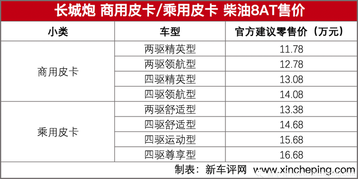 9月12日,长城皮卡在海南宣布炮乘用皮卡、商用皮卡柴油8AT正式上市,共推炮乘用皮卡柴油8AT 4款车型,售价区间13.38万-16.68万元,商用皮卡柴油8AT 4款车型,售价区间为11.78万-14.08万元。至此,长城炮 (配置|询价)在售车型增至36款,包括越野版、汽油版商用和乘用皮卡。这么多款车型,消费者会不会选晕?