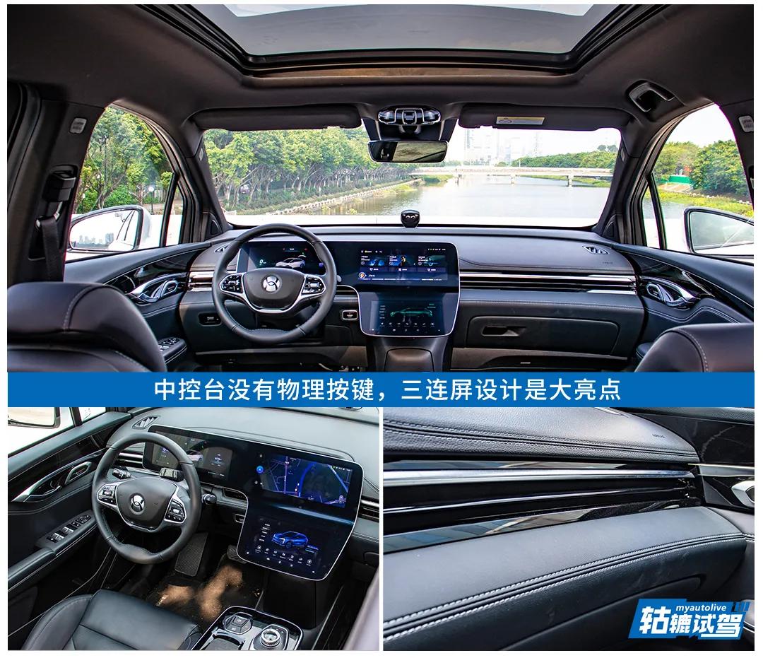 更有看点的是车厢内部设计,中控台没有一个物理按键,并且还配备了三体屏,打开车门就能感受到很强的科技感。另外,中控台的空调出风口也与常见的车型不同,广汽蔚来007配备的是隐藏式空调出风口,这种设计的好处是让整个内饰氛围更加简约大气,但可能也有不少人难以接受如此简单的设计。
