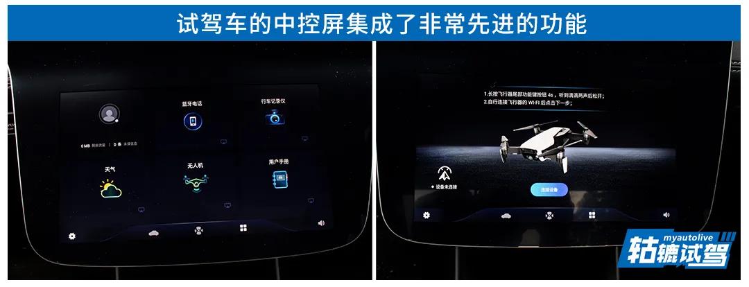 值得一提的是,三块大屏幕集成了相当丰富的功能,除了有360度全景影像、手机投屏等常见的各种智能配置,还可以将下方屏幕的功能拖至上方屏幕,并且上手难度不高,玩起来特别有意思。不仅如此,如果你平时爱玩无人飞机,还可以将无人机的屏幕投射至广汽蔚来007的屏幕上,这样开着车去郊外玩无人机不仅更便利,而且开车也更加安全。不过限于条件,轱辘哥没有实测无人机的投屏效果。