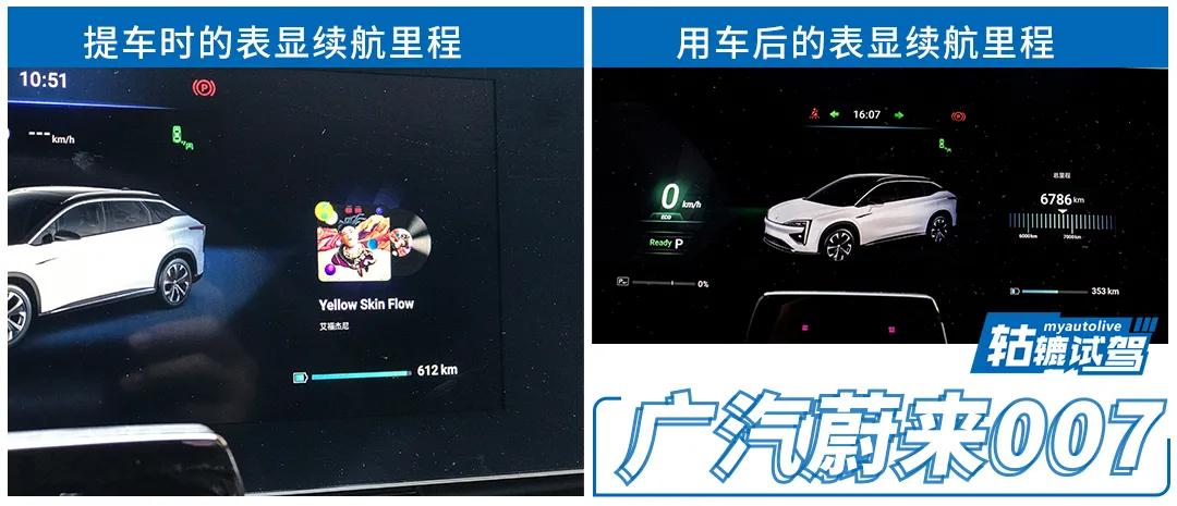不仅是续航长,广汽蔚来007的续航衰减速度也比较慢。轱辘哥试驾的是PLUS版本,拿到车辆时仪表盘显示的续航里程是612km,试驾过程中行走了低速和高速路段,总里程有210km左右,最终仪表盘显示还能行走353km,通过换算得知的续航里程掉了259km。