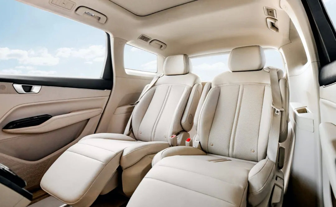 后排可选择标准座位或行政座位。其中,行政座位配备了两张独立座椅,靠背支持55度倾斜并配备腿托,老板和秘书都能坐的舒服。