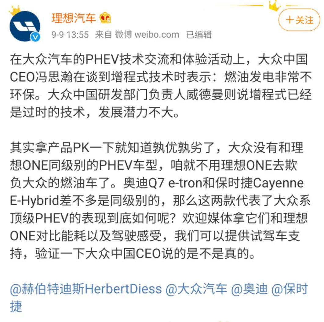 9月9日,走增程式电动车路线的理想汽车创始人李想在社交平台称:“非常愿意和大众旗下最先进的PHEV进行节能环保的对比测试,最好北上广三地开展三个月,每个地区找一个专业媒体,模拟真实的使用场景(也可以参考大众中国CEO的日常使用场景),用最真实的数字看看现实中谁更节能环保。和理想ONE尺寸级别最接近的是七座版奥迪Q7 PHEV,欢迎大众/奥迪参与对比测试。”