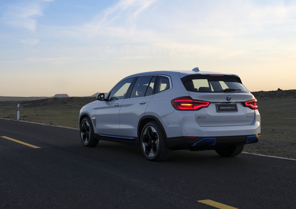 宝马iX3 的尾部造型同样遵循着燃油版的设计,不过左下角的车型铭牌变为了iX3,此外燃油版排气管的位置也变为了蓝色的扩散器样式。