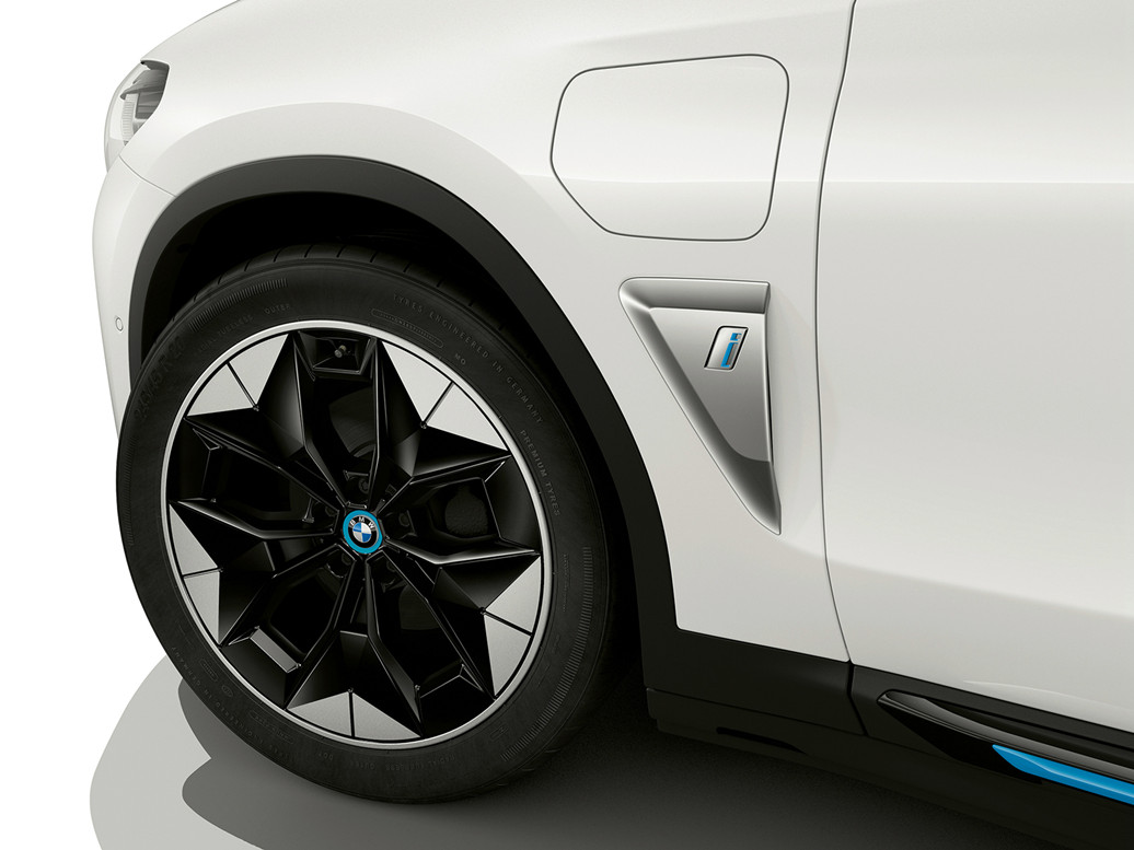 车身侧面,它的变化会更加明显一些,左前翼子板处带有充电口,并且下方有一块饰板,里面带有“i”系列字母标识。与此同时,它还搭载了一套低风阻的轮圈,车门下方同样带有蓝色的装饰条。