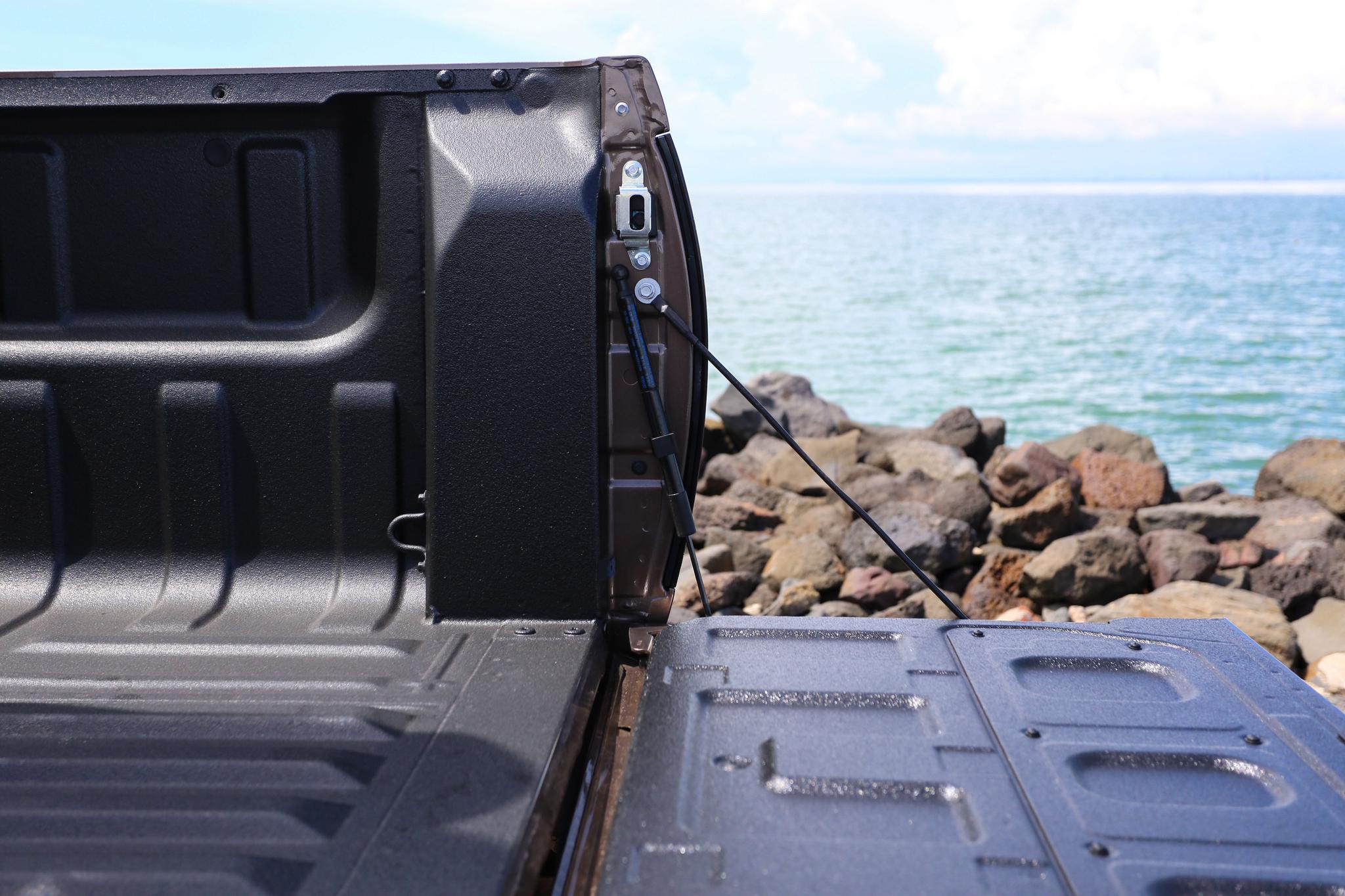 首先车辆在原厂的状态下已经在后斗内安装了防擦的货箱宝;其次后斗尾门处隐藏装配了一个非常便捷脚蹬梯方便上下车;后斗尾配备的液压连杆增加了阻尼感,能够防止尾门突然下摆砸伤到人。