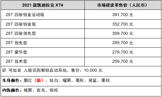 2020年9月15日,上汽通用汽车凯迪拉克品牌宣布,2021款新美式运动SUV凯迪拉克XT4燃情上市。新车在承袭原有配置的基础上,支持装备人脸识别解锁启动系统、升级全新一代车载互联系统,并新增胭红外观颜色,进一步满足新生代年轻消费者,对于汽车产品个性化和移动智能出行的需求。